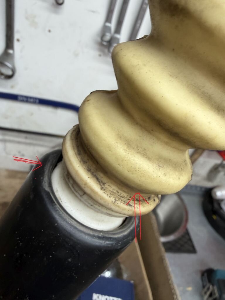 Ich habe es bei mir heute geprüft: Es ist der Anschlagpuffer samt Schutzhülle. Siehe Video. Nein, der Stoßdämpfer liegt nicht auf dem Anschlag auf. 😁Trotzdem macht er diese Geräusche beim normalen Fahren. Ich habe zum testen einen Rangierwagenheber unter der Feder gehabt und quasi so getan, als wenn das Rad montiert wäre. Das Fahrzeug und die Achse hatte also ganz normale Fahrposition. Und dann am Fahrzeug gewackelt. LÖSUNG: Ich habe die Hülle vom Anschlagpuffer gedreht/ abgezogen. Einmal alles sauber gemacht, zusammengesetzt und mit Silikonöl besprüht. Das würde auch im eingebauten Zustand ohne jegliche Demontage (außer des Rades) gehen. Fehler weg. Rechts ist das Geräusch interessanterweise nicht da. An den mit den Pfeilen markierten Stellen entsteht das Geräusch. Schon beim reinen Wackeln an den Plastikkappen. Img 5345.mkv