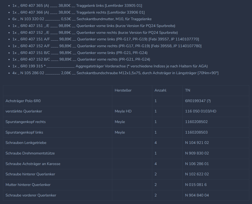 Moin zusammen, ich möchte gerne mein Bilstein B8 und die KAW50/30 rausschmeißen und gegen was komfortableres und vor allem nicht ganz so tiefes tauschen. ich denke einfach das Fahrwerk ist mittlerweile nach 12 Jahren durch. Hat jemand die ST-X in Verwendung? Der Preisunterschied beträgt 340€. zudem möchte ich gerne die wichtigsten Teile am Fahrwerk erneuern, wenn man sowieso schon dran ist. direkt auf PQ25 umbauen? habe die letzten Wochen nach PQ25 bei Kleinanzeigen und co ausschau gehalten, aber nie was brauchbares gefunden, da ich auch nicht genau weiß, ob 100% passend oder nicht. würde dann 185/55 R15 Ganzjahresreifen besorgen und alles zusammen eintragen lassen. Teileliste hätte ich hier einiges zusammengekratzt: Auspuffhalter muss beim FSI ja auch passen bzw. unterscheidet sich vom 1.4er? würde, wenn möglich das meiste bei motointegrator holen. schrauben etc. bei VW? noch irgendwas dazu? SuperPU Buchsen? neue Koppelstangen? direkt mitmachen? bei einigen Teilenummern bin ich mir unsicher. kann mir jemand behilflich sein? ich danke