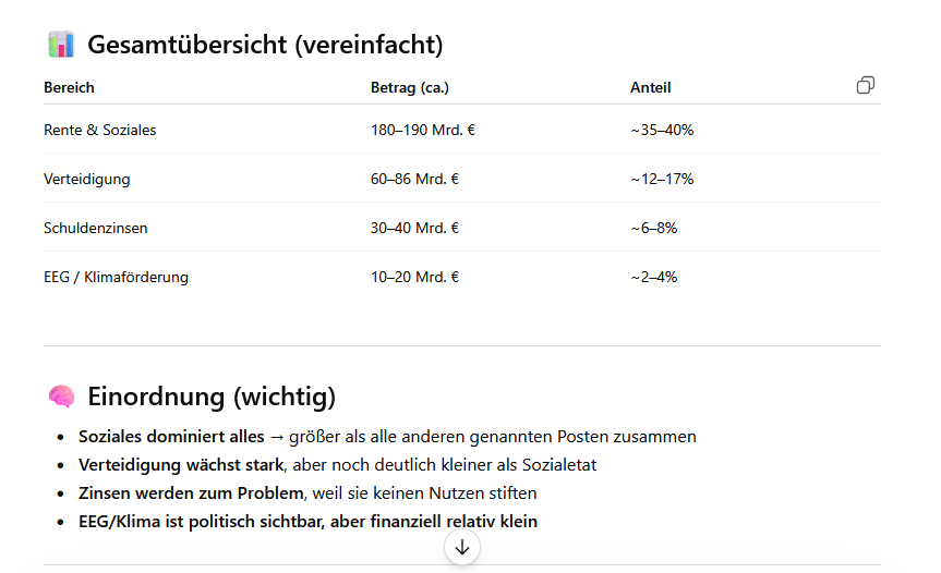 Wird zwar politisch, aber der Hinweis ist vielleicht erlaubt: Mit die größten Posten im Steuer-Haushalt, die wir uns Deutsche gönnen sind Rente und Soziales. Die gute Haushaltsplanung und Regierungen der letzten 20 Jahre sorgen dafür, dass 2029 Zinsen, Soziales, Rente und Verteidigung den kompletten Haushalt auffressen. "Ja alle haben sich das verdient...." Aber zur Frage, ob das Problem ein wenig "Umweltsteuern sind" ist wieder weitermachen im deutschen KleinKlein und die großen Themen ausklammern. Und ihr fragt woher der Tankrabatt kommt ??? Aus der Ideenlosigkeit , dass "es früher doch klappte und man da ja nur wieder hinmuss" Ja hätten wir 10-20 Mrd mehr.... oder ein Sondervermögen von 100-200 Mrd , dann wäre der Deutsche Michel glücklich... Ach ne wir haben ja 500 Mrd Sondervermögen und stopfen damit Löcher