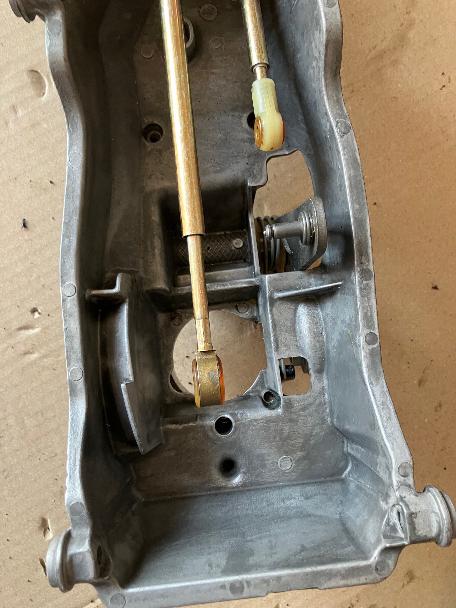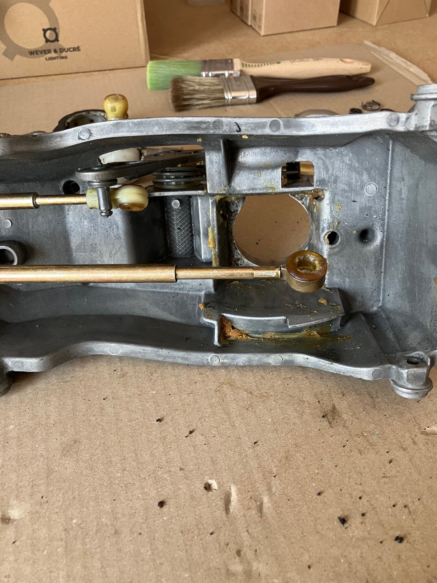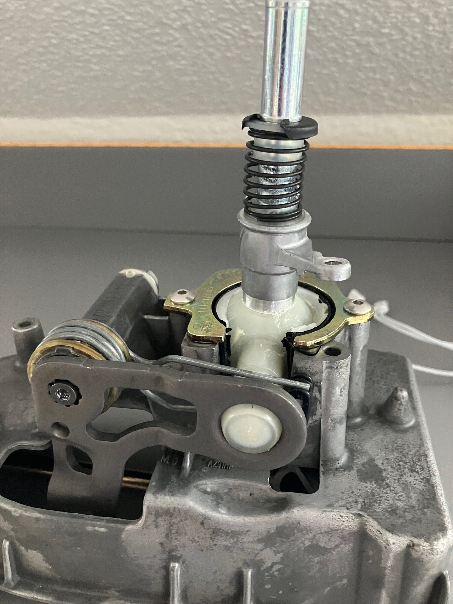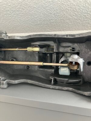 Update, da ich vor geraumer Zeit einen netten "Spender" für die komplette Schaltung gefunden habe: Für das Entfernen/Anbringen der Schaltseile müssen lediglich die Haltescheiben entfernt werden, diese können wieder verwendet werden. Dann die Seile einfach runter ziehen (beim Schalthebel sitzen die recht fest drauf). Der Schalthebel kann mit etwas Geschick entfernt und eingesetzt werden, ohne die Gabel entfernen zu müssen. Ich hätte sie gerne entfernt, weil ich eigentlich auch die Feder tauschen wollte, leider reagiert der Schraubenkopf bereits beim Anblick eines Schraubenziehers mit totaler Selbstauflösung. Basierend auf der Explosionszeichnung hatte ich auch davon abgesehen, diese rauszubohren. Wenn ich eine Werkstatt gefunden habe die das Eckige dann noch in das Runde einbaut, kann die aufbereitete Verkleidung auch wieder rein. (Ja, das silber ist teils nicht so gelungen)....