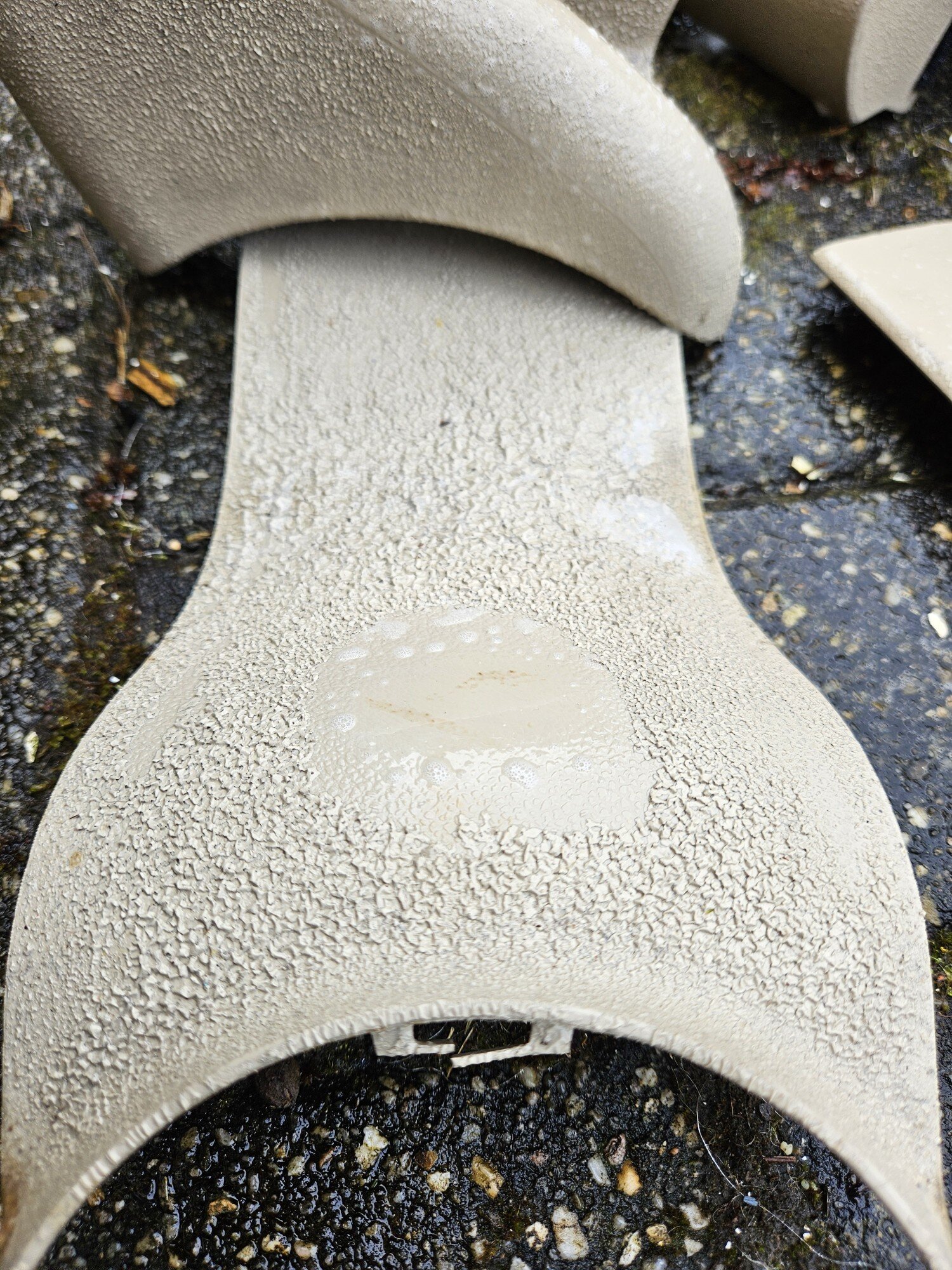 Und nun auch die Teile der zweiten Kugel frühjahrsgeputzt, diesen Reiniger aufgesprüht und nach nicht einmal fünf Minuten hat der Softlack von allein aufgegeben. Anschließend mit einem grünen Pad die Teile geputzt, der Gartenschlauch hat schließlich den Rest erledigt. Eine sehr einfache Methode und ohne Lösemittel.