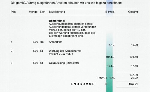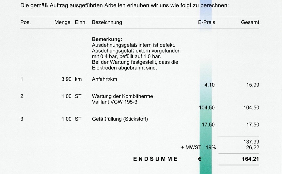 Bei uns waren es Anfang Februar 164,21€ (letzte Wartung vor13 Monaten). Elektrode musste getauscht werden (die zahlt unsere Vermieterin).