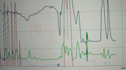 Halllo nochmal, Anbei die Aufzeichnung vom BBY wo die Taktung null ist und die Öffnung mit dem Saugrohrdruck korreliert. Grün ist Saugrohrdruck und hellblau ist Öffnung. Rot ist die Taktung (Messwerblock 76). Dunkelblau die Drehzahl. Wie kann sowas passieren, Massefehler? Massepunkte habe ich schon gereinigt, war unauffällig. Grüße, Manuel