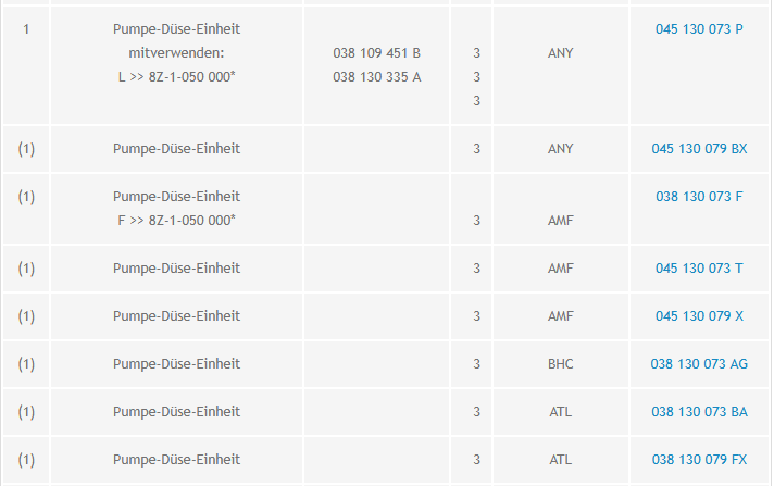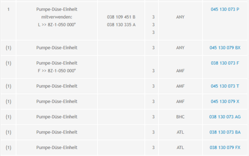 AMF: 038 130 073 F (Bis mitte MJ 01) 045 130 073 T (Rest) 045 130 079 X (Vermutlich ein "Refurbished" Teil) ATL: 038 130 073 BA (Alle) 038 130 079 FX (Vermutlich ein "Refurbished" Teil)