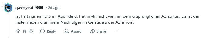 Nun auch bei Edison, einem Magazin für E-Autos: https://edison.media/verkehr/audi-a2-kehrt-ende-2026-als-stromer-zurueck/25263387/ -