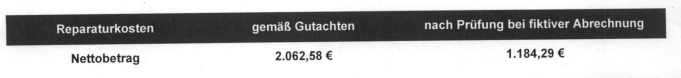 14. Nein, die geschätzten Reparaturkosten sind ja immer inkl. 19% Mehrwertsteuer, die werden dir grundsätzlich nicht erstattet bei der fiktiven Abrechnung. Ob das jetzt nur die Arbeitskosten waren oder auch die Teile müsste ich nachsehen. Meine beiden letzten Schäden wurden beide anwaltliche geprüft, das ist so üblich und leider nicht zu beanstanden.