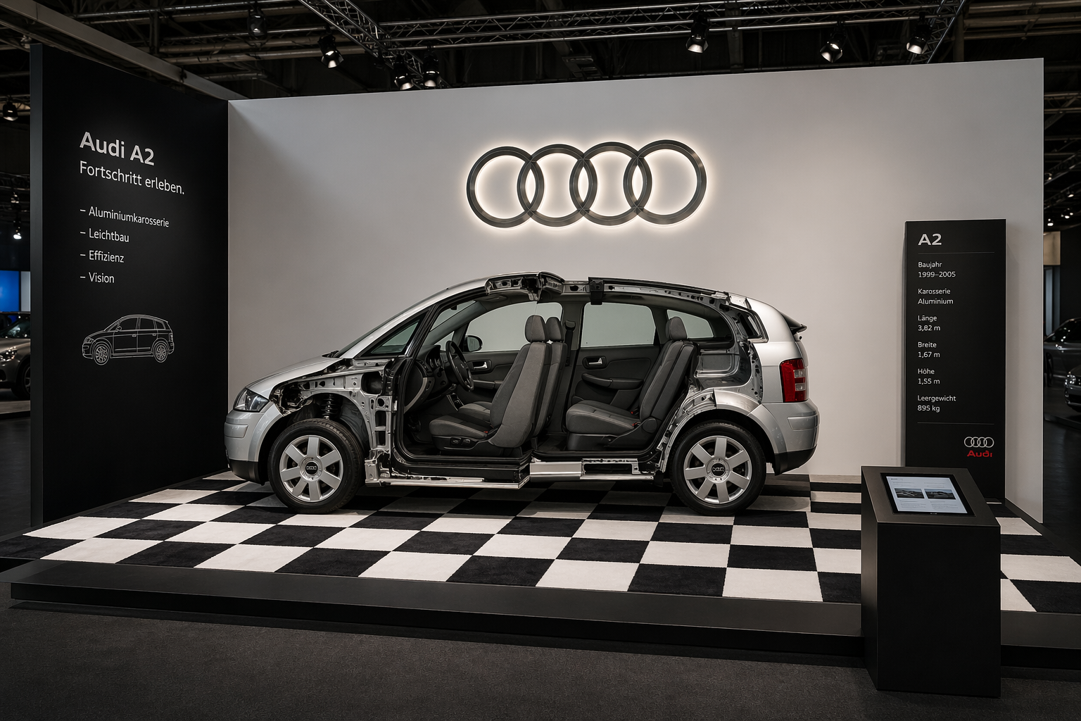 2. So ähnlich wäre schön und hatte die KI auch als Messestandentwurf vorgeschlagen: Liegt aber leider doch deutlich über Zeit- und Kostenbudget bei einer Hand voll Leuten... Letztes Jahr (Link: KTSH 2025) sah es so aus: Für dieses Jahr ist noch offen, welche Autos auf den Stand sollen, ATL und 3L wäre vielleicht zu diesellastig? 3L scheint wegen der Spritpreisthematik evtl geboten. Ob wir uns einen 500€ Kleinanzeigenfund (in entsprechendem Zustand) als Exponat trauen, überlegen wir noch... Spaceframe scheint aber gesetzt Danke für das Angebot! Wäre wohl die schlauste und bequemste Lösung... Persönlich tendiere ich ja dazu, das @Nordkugeln den ältesten A2 des Forums opfert , die Nr. 1 hier: