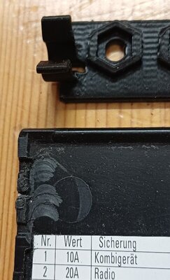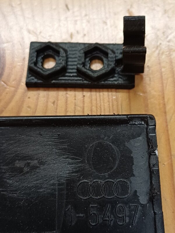 Hallo A2 Freunde, Ich habe mein A2 im Sommer gekauft und beschäftige mich gerade mit Kleinigkeiten wie ein beschädigte Deckel für den Sicherungskasten. Da waren die Clipse abgebrochen. Gebraucht gab es nichts bis auf einen einzigen überteuerten Angebot in Biege. Bei Audi Tradition gab es für 9€ einen biegen, aber wie es sich rausstellte war es für rechtslenker. Es gibt einen 3D-Druck Datei Angebot aus Polen, der ist aber gerade und das Original ist leicht krum und auch sehr leicht in-sich verdreht. Daraufhin, habe ich das Original gemessen und in CAD dargestellt (dann gespiegelt für Linkslenker) und dazu 2 verstärkte Clip-Platten konstruiert. Sie sind in ASA auf der Seite liegend gedruckt wegen die Krummung und die höchste Festigkeit der Clipse bei entsprechender Faserrichtung. Die alte Clipreste habe ich abgeschnitten und die kleine Abstellungen am Rand in Höhe und Dicke reduziert. Dann habe ich mit M4 Edelstahl Schrauben mit schwarz lackierten Kopf alles zusammen geschraubt. Der Deckel lässt sich nun perfekt montieren/demontieren und dürfte um einiges stabiler sein als jemals ab Werk. Vorteilhaft ist auch: Falls etwas doch brechen sollte, muss ich das kleine Teil einfach nochmals drucken. Ich versuche ein paar Bilder und die 3D Druck Dateien hochzuladen