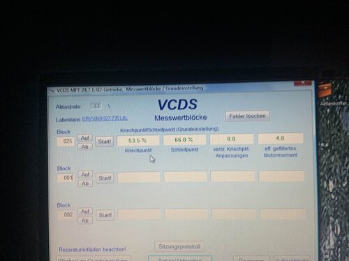 Also ich habe nochmal eine GGE gemacht und wollte danach die Kriech- und Schleifpunktanpassung im MSB 25 machen, aber heute war es das erste Mal. dass er mich es nicht machen lassen hat und schon auf 0 stand, obwohl die Werte komplett außer Kehr sind. Anbei sind ein paar VCDS Werte und ein Video, wo für euch hoffentlich ersichtlich wird, dass er beim Anfahren und Rückwärtsfahren (ohne Gas zu geben) komplett zupft, weil er meiner Meinung nach nicht genug trennt. Das hohe Geräusch kommt von meinem Beifahrersitz (immer wenn keiner drauf sitzt), weil durch das Anfahren/Rückwärtsfahren das Auto so dermaßen durchgeschüttelt wird. KNZ Wert ist auf 1,89V eingestellt und schaltet sonst auch super gut (vielleicht doch noch etwas nach oben verändern?) Ich habe mir eben das Video selber nochmal angehört und da ist mir das Schlaggeräusch beim Einlegen des Gangs von N auf D und von N auf R aufgefallen. Das ist mir neu und vorher noch nie so aufgefallen. IMG_7555.mov