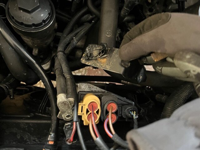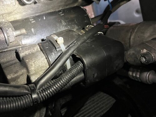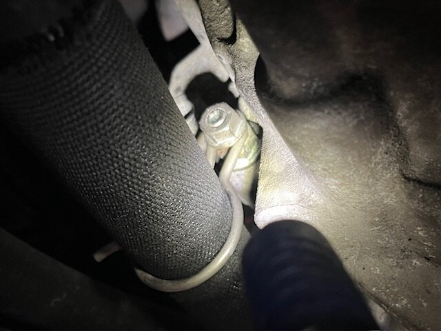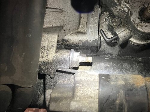 9. Kullungsleitung entfernen 10. Stecker Leerlaufschalter(?) entfernen 11. Stecker Anlasser entfernen 12. Kappe Anlasser entfernen (der gelbe Kabelbilder) 13. Kabel Anlasser entfernen M13 14. Halteblech am Anlasser entfernen M13 15. Obere Anlasserschraube entfernen M18 16. Die beiden oberen Getriebeschrauben entfernen M18 (die hintere ist schwer zugänglich und könnte auch nach ablassen des Getriebes entfernt werden, da sie dann leichter zugänglich ist) -