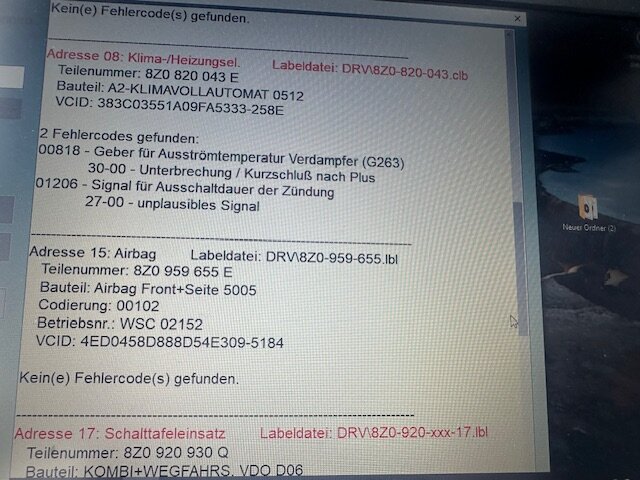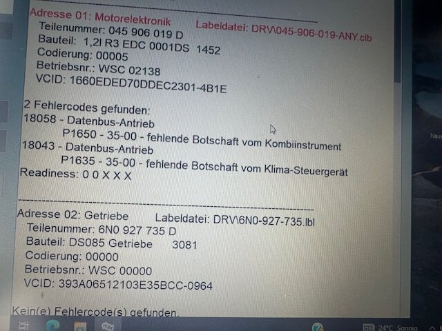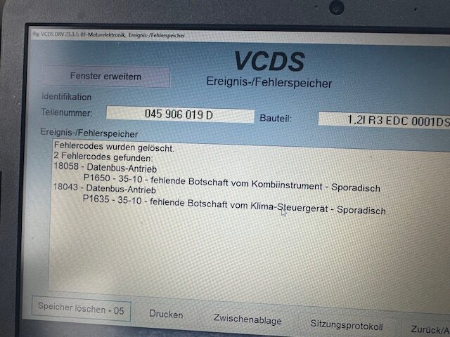 Liebe Gemeinde. Wie schon in einem anderen Thread geschrieben habe ich Probleme mit meiner 1,2er Sparkugel. Es kamen keine Fragen mehr an die Spezialisten, und ich bin mit meinem Latein am Ende, vielleicht hat jemand eine oder mehrere Ideen? Symptome sind: - unruhiger Leerlauf, er hat aktuell ca. 220000km drauf, deshalb würde ich den Kettenspanner mit dem Ausgleichsgewicht noch nicht pauschal verdächtigen. Synchronisationswinkel ist 0 + - ca. 0,3 Eventuell könnte auch ein Motorlager dran schuld sein, der Doppeltemperaturfühler zeigt in beiden Messwertblöcken so gut wie die gleiche Temperatur an. Er erreicht nicht ganz die 90 Grad, aber das sollte normal sein. Ich bringe ihn nicht unter 3,6 Liter. Das originale Kombiinstrument zeigt keine Ganganzeige an, ebenso ist der Drehzahlmesser tot. Auch die Ölstandsmeldung leuchtet kurz nach dem Start obwohl genügend Öl drin ist, Ölfilter und Motoröl sind neu, Serviceklappe offen und wieder schließen bringt auch nichts, die Warnung bleibt bestehen. Kuppplung und Führungshülse sind neu, Getriebegrundeinstellung ist vielleicht 500km her, Kriechpunkt ist angelernt, Getriebe schaltet sauber. Bei zwei quergetauschten Kombiinstrumenten funktioniert alles oben beschriebene. Das originale Kombi wurde durch einen Fachmann an allen bekannten Stellen nachbearbeitet, sodass kalte Lötstellen eigentlich ausgeschlossen werden können. Den Stecker vom Motorsteuergerät habe ich schon auf Korrision geprüft und mit Kontaktspray eingesprüht, bevor ich es nach 5 Minuten wieder zusammengebaut habe. Massepunkte sind gereinigt, mit Kupferpaste eingeschmiert und wieder angebracht. Batterie ist neu, wird aber langsam durch irgendeinen Verbraucher leer gezogen. Die Ladespannung ist bei ca. 14,5 Volt. VCDS zeigt folgende Fehler an: Vielleicht hat jemand eine Idee, evtl. CAN BUS (wie prüfe ich das)? Vielleicht fällt mir noch was ein, aber bisher ist das alles was mir einfällt. Vielen Dank für eure Tipps und Mithilfe 👍🏼 -
